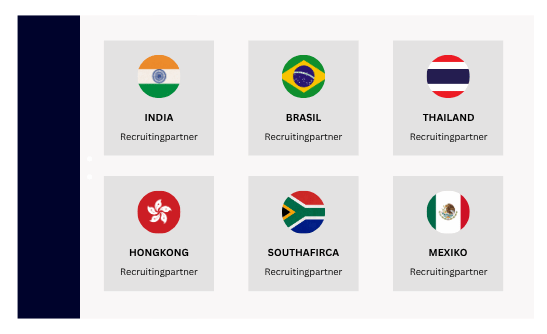 Wir suchen starke, verlässliche Partner in Drittstaaten, die uns dabei unterstützen, qualifizierte Fachkräfte für Unternehmenin Deutschland zu gewinnen. Ihre Aufgabe: In Ihrem Land Talente identifizieren, ansprechen und für eine Karriere in Deutschland begeistern. Unser Konzept: Eine enge, langfristige Zusammenarbeit. Wir verbinden Ihre lokalen Netzwerke und Marktkenntnisse mit unserem Know-how im Recruiting, den rechtlichen Verfahren und der Integration in Deutschland. Gemeinsam schaffen wir Perspektiven – für Fachkräfte, Unternehmen und unsere Partner. Besonders gefragt sind Fachkräfte aus Mexiko, Thailand, Hongkong, Brasilien und Südafrika – junge, motivierte Menschen mit Kompetenzen in technischen, gewerblichen und digitalen Berufen. Werden Sie Teil eines starken Netzwerks und gestalten Sie mit uns die Fachkräftegewinnung der Zukunft.